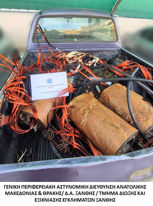 Οι αστυνομικοί του τμήματος Δίωξης και Εξιχνίασης Εγκλημάτων Ξάνθης, των ομάδων Πρόληψης και Καταστολής Εγκληματικότητας Ξάνθης και του τμήματος Συνοριακής Φυλακής Κ. Νευροκοπίου Δράμας εντόπισαν και συνέλαβαν τους δράστες, διότι νωρίτερα επιβαίνοντες σε Ι.Χ.Φ. αυτοκίνητο μετέβησαν σε οικισμό της Ροδόπης και αφαίρεσαν από μετασχηματιστή της ΔΕΔΔΗΕ τρία πηνία χαλκού.